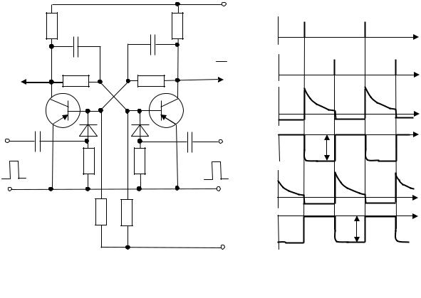 Рис. 10.53. Симметричный триггер с коллекторно-базовыми связями и раздельным запуском (а) и временные диаграммы его работы (б)