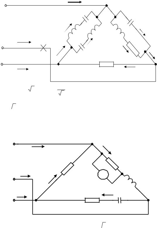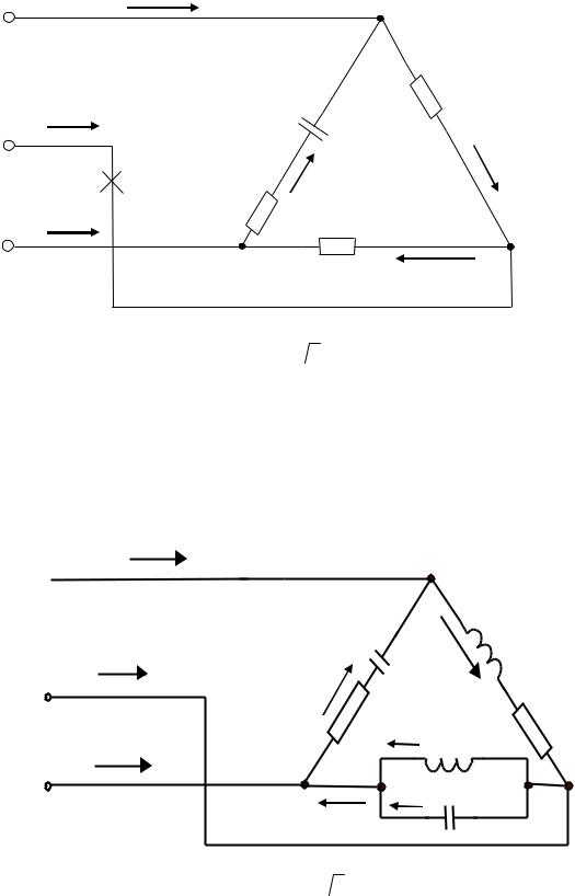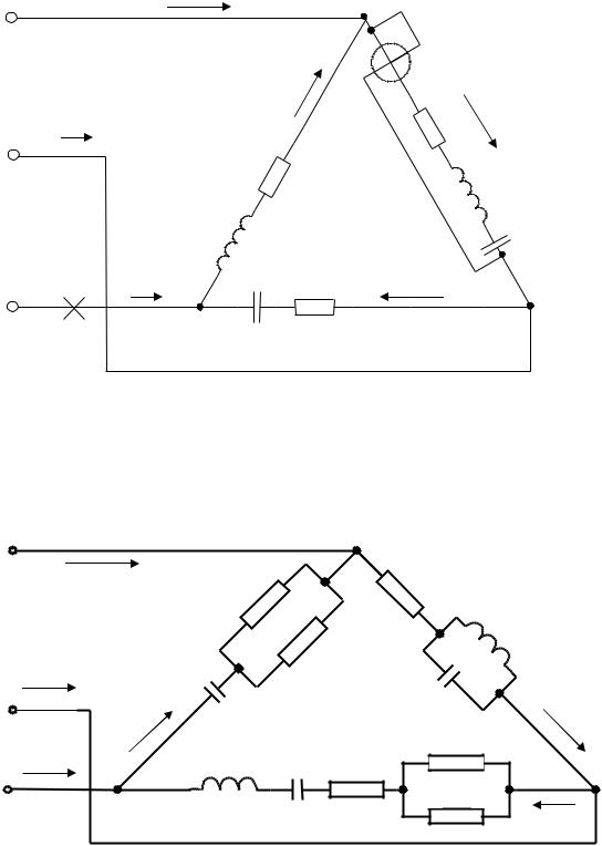 XС1=120 Ом; XС2=100 Ом; XС3=50 Ом; линейный провод В находится в обрыве;
