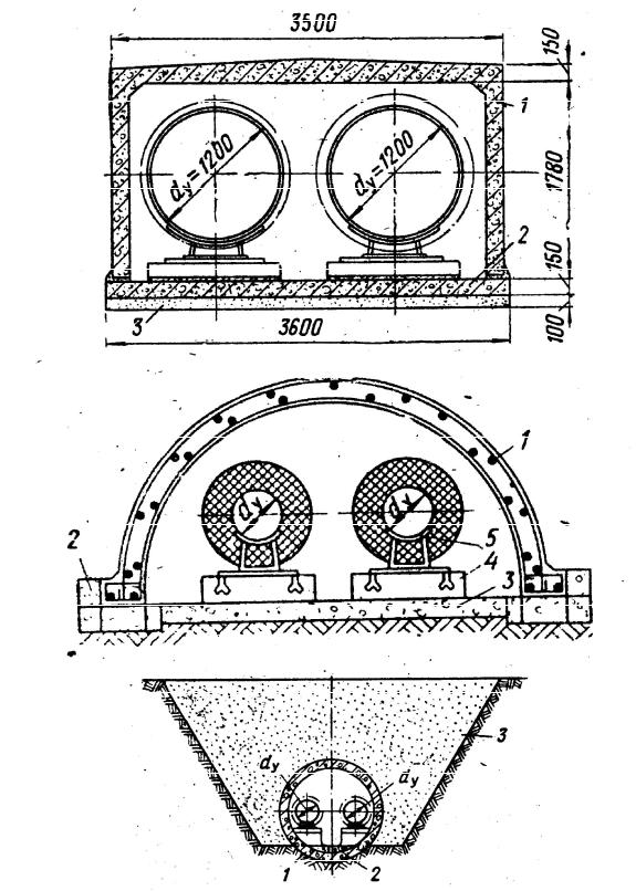 2– бетонный фундамент; 3 – бетонная плита; 4 – опорные плиты; 5 – опоры теплопровода; в – полупроходной канал: 1 – железобетонная труба;