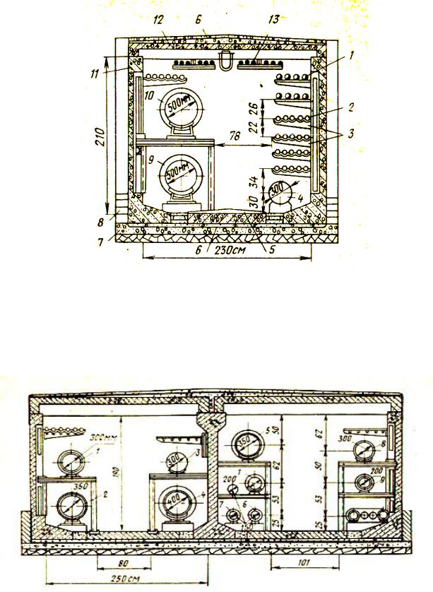 5 – железобетонный лок днища;6 – оклеечная гидроизоляция; 7 – бетонная подготовка; 8 – кирпичная защитная стенка; 9 – теплопровод; 10 – обратный теплопровод; 11 – ре ристый стеновой блок; 12 – плита перекрытия;