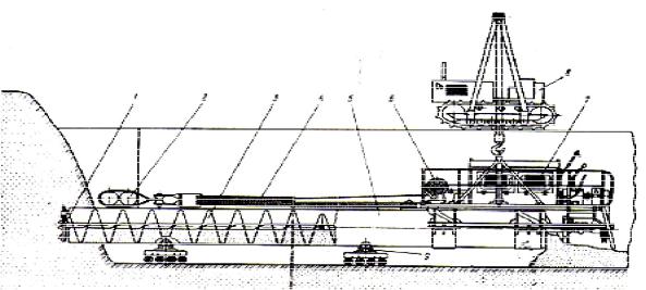 5 – нажимной патрубок; 6 – направляющая рама; 7 – рабочий котлован; 8 – прокладываемая труба (кожух); 9 – нож; 10 – приемный котлован