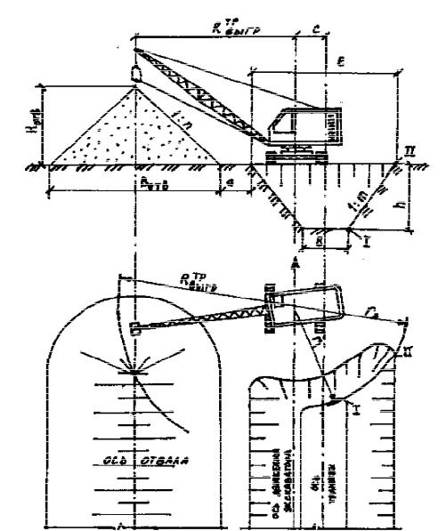 Экскаватор-драглайн, имеющий удлиненную стрелу и ковш, свободно подвешенный на тросе, применяют при разработке глубоких котлованов и траншей с отсыпкой грунта в отвал или в автосамосвал (рис. 4.3).