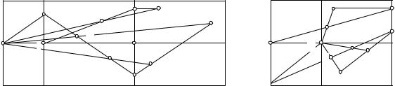 Техника отыскания проекции точек и прямых предметной плоскости на эпюрах иллюстрируется рис. 2.7 и 2.8 (точки схода и двойные точки на чертежах не обозначены). К недостаткам эпюра растяжения относится наличие острых углов в точках пересечения прямых, затрудняющих уверенное отыскание проекций, а эпюра сложения – большая загруженность чертежа из-за совмещенного положения картинной и предметной плоскостей.
