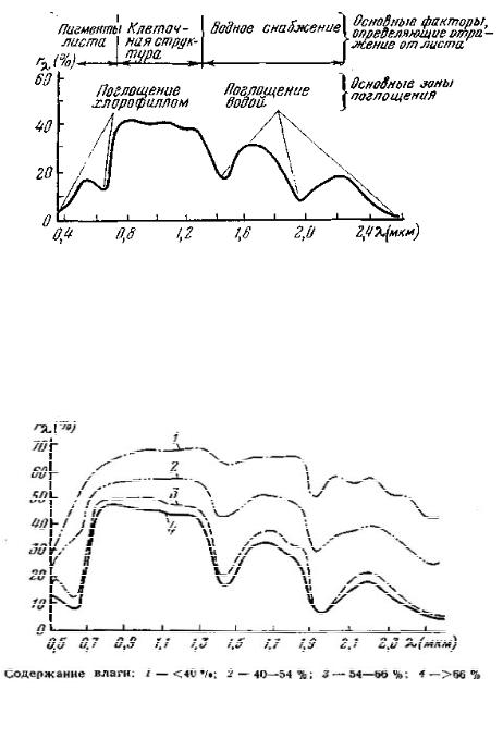 Ход кривой КСЯ в средней зоне λλ = 1,3-2,6 мкм определяется интенсивностью поглощения радиации водой в интервалах с максимумами около 1,4; 1,9 и 2,6 мкм. Интегральный уровень отражения в этой зоне зависит от содержания влаги в листьях зависимость обратная (рис. 8.4).