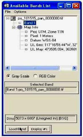 логическое поле Gray Scale отмечено флажком, выберите Band 1 для файла, который только что открыли, и нажмите кнопку Load Band для вывода данного диапазона изображения на экран. Примечание. Для вывода на экран мультиспектрального диапазона в цветах RGB установите флажок в поле RGB Color, выберите диапазон для каждого канала (R для красного, G для зеленого и B для синего), и затем нажмите кнопку Load Band.