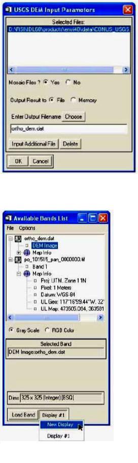 7.В диалоговом окне AVAILABLE BANDS LIST установите флажок в поле Gray Scale и выберите пункт DEM Image в списке под файлом ortho_dem.dat.