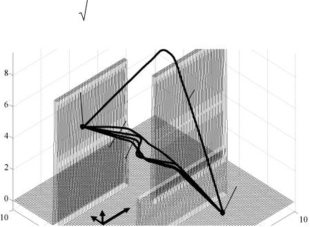 Улучшить эффективность поиска кратчайшего пути в среде с препятствиями можно за счет изменения алгоритма подготовки матрицы весов графа. Предлагается, во-первых, уменьшить количество вершин графа, сформировав из него подграф, принимая в рассмотрение только точки, расположенные на поверхности препятствий выше определенного уровня, например уровня нижней из двух точек начала/окончания пути (рис. 3.28). Свободные узлы (вне препятствий), равно как и узлы, находящиеся внутри препятствий, при этом способе исключаются из рассмотрения, что значительно уменьшает размеры матрицы смежности и ускоряет поиск пути. Исключение составляют две точки: начальная и конечная, которые учитываются, хотя находятся вне препятствий. Начальная точка будет первой в списке вершин подграфа, конечная – последней. Рассматриваемые точки будут располагаться на равномерной сетке относительно координат x и z.