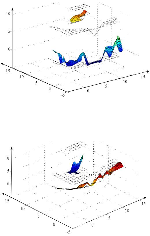 Наличие препятствий значительно уменьшает область возможного расположения базового шасси в пределах рассматриваемой области (рис. 4.56–4.62). Значение целевой функции (временного критерия, или времени реализации) для оптимальной траектории составляет T=30 с, что примерно в 2 раза больше времени реализации оптимальной траектории в серии экспериментов № 2 и обусловлено необходимостью обхода препятствий.