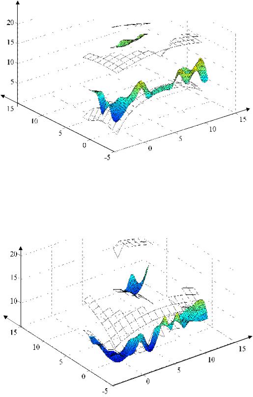 Рис. 4.62. Зависимость временного критерия эффективности T от положений базового шасси q1, q3 при наличии препятствий и ограничении на предельную линейную скорость груза (серия экспериментов № 3)