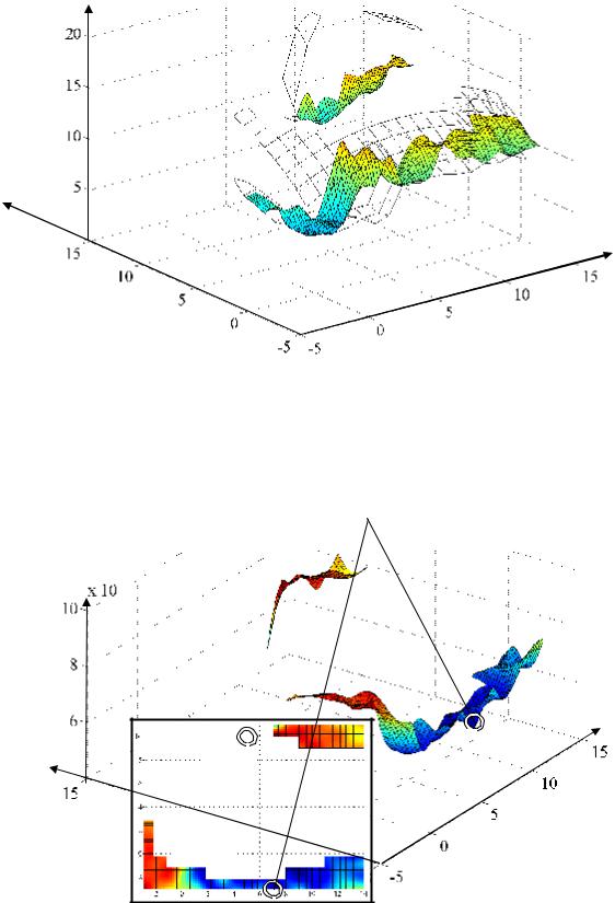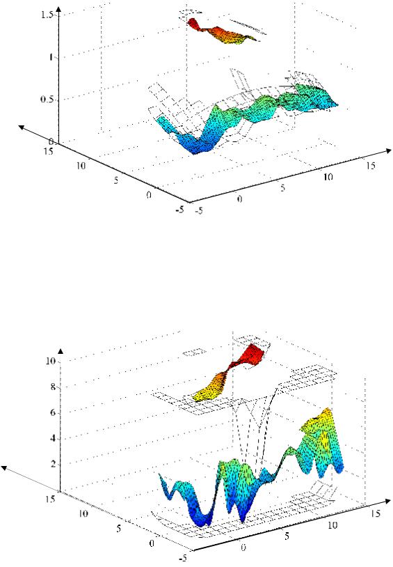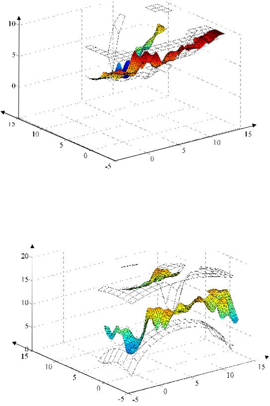 Анализ результатов серии экспериментов № 5 позволяет сделать выводы, аналогичные выводам серии № 3: наличие препятствий в рабочей области добавляет на график зависимости энергетического критерия Ae от начального и конечного значений управляемых координат q8, q9, q10 множество локальных экстремумов, что непредсказуемо меняет положение точки глобального минимума (рис. 4.72) на указанном графике и вследствие этого точки глобального минимума q1, q3 на графике зависимости целевой функции от положений базового шасси.
