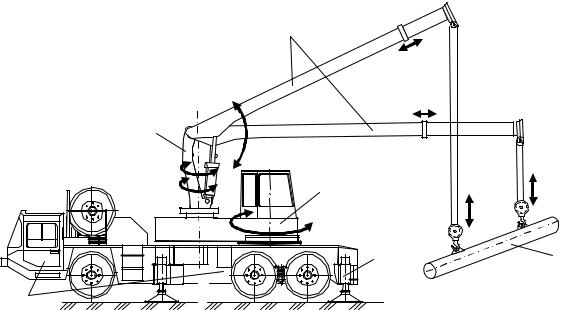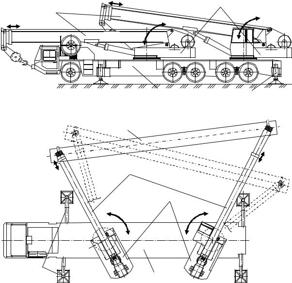 Вариант 2. Самоходный двухстреловой ГПК содержит опорную платформу на базе автомобильного или гусеничного самоходного шасси 1 с выносными, выдвижными или откидными опорными элементами 2 в количестве четырех штук, одну поворотную платформу 3, две поворотные колонны 6, две телескопические стрелы 4 (рис. 6.23, рис. 6.24).