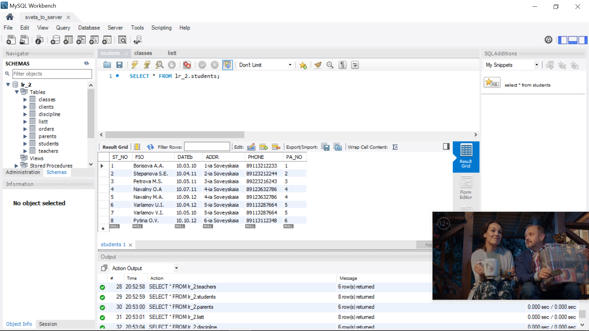 insert into students values ('1', 'Borisova A.A.','10.03.10', '1-ia Soveyskaia', '89113212233', '1'); insert into students values ('2', 'Stepanova S.E.', '10.04.11','2-ia Soveyskaia', '89123212244', '2'); insert into students values ('3', 'Petrova M.S.', '10.05.11','3-ia Soveyskaia', '89223216243', '3'); insert into students values ('4', 'Navalny O.A', '10.07.11','4-ia Soveyskaia', '89123632786', '4'); insert into students values ('5', 'Navalny M.A.', '10.09.12','4-ia Soveyskaia', '89123632786', '4'); insert into students values ('6', 'Varlamov U.I.', '10.04.12','5-ia Soveyskaia', '89113287664', '5'); insert into students values ('7', 'Varlamov V.I.', '10.05.10','5-ia Soveyskaia', '89113287664', '5'); insert into students values ('8', 'Pytina O.V.', '10.10.12','6-ia Soveyskaia', '89113112348', '6');