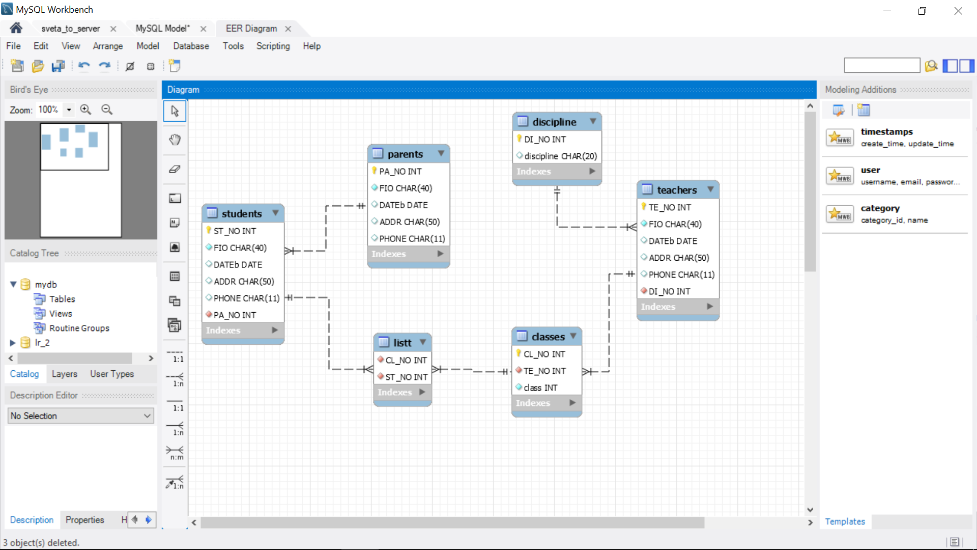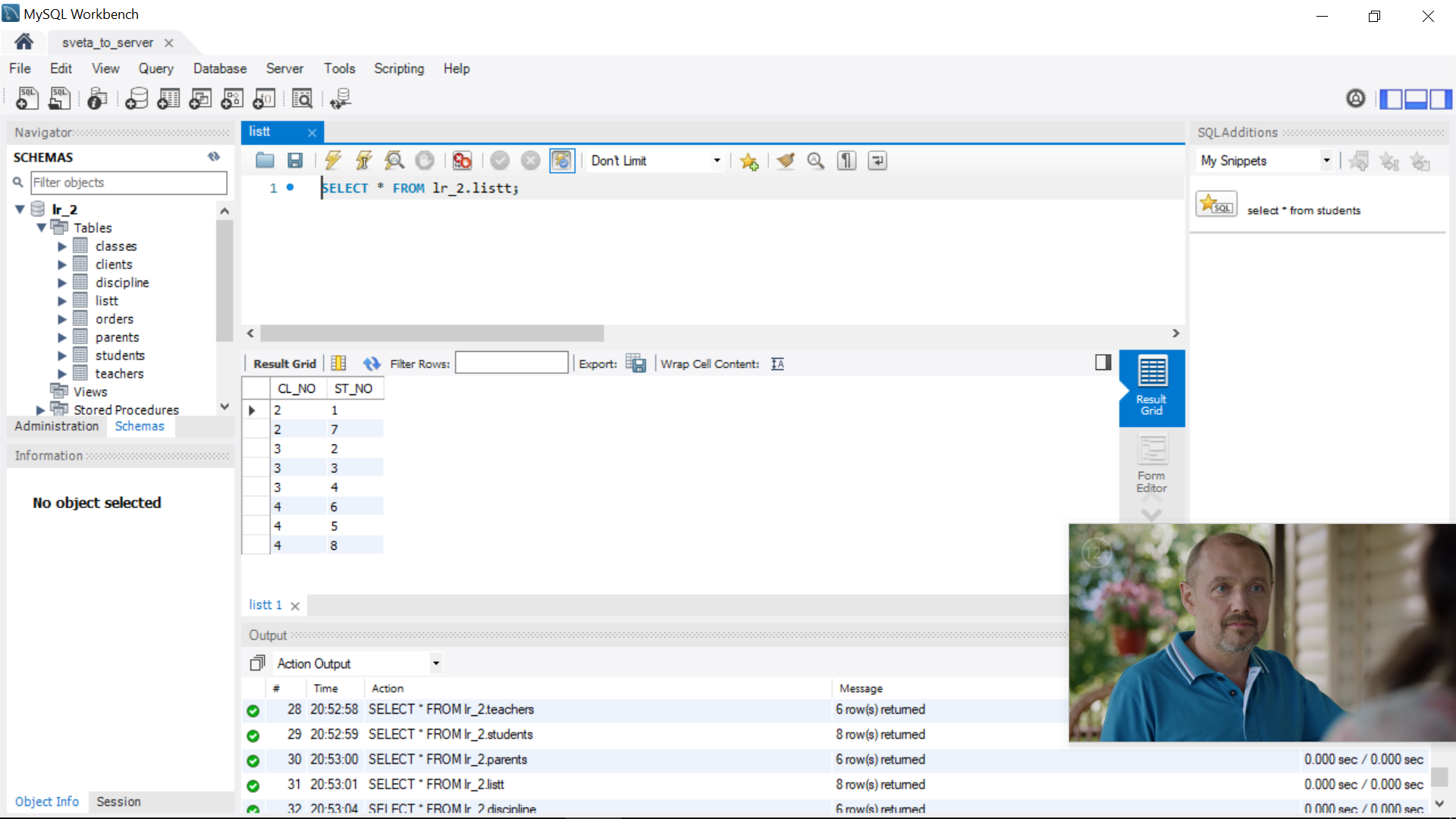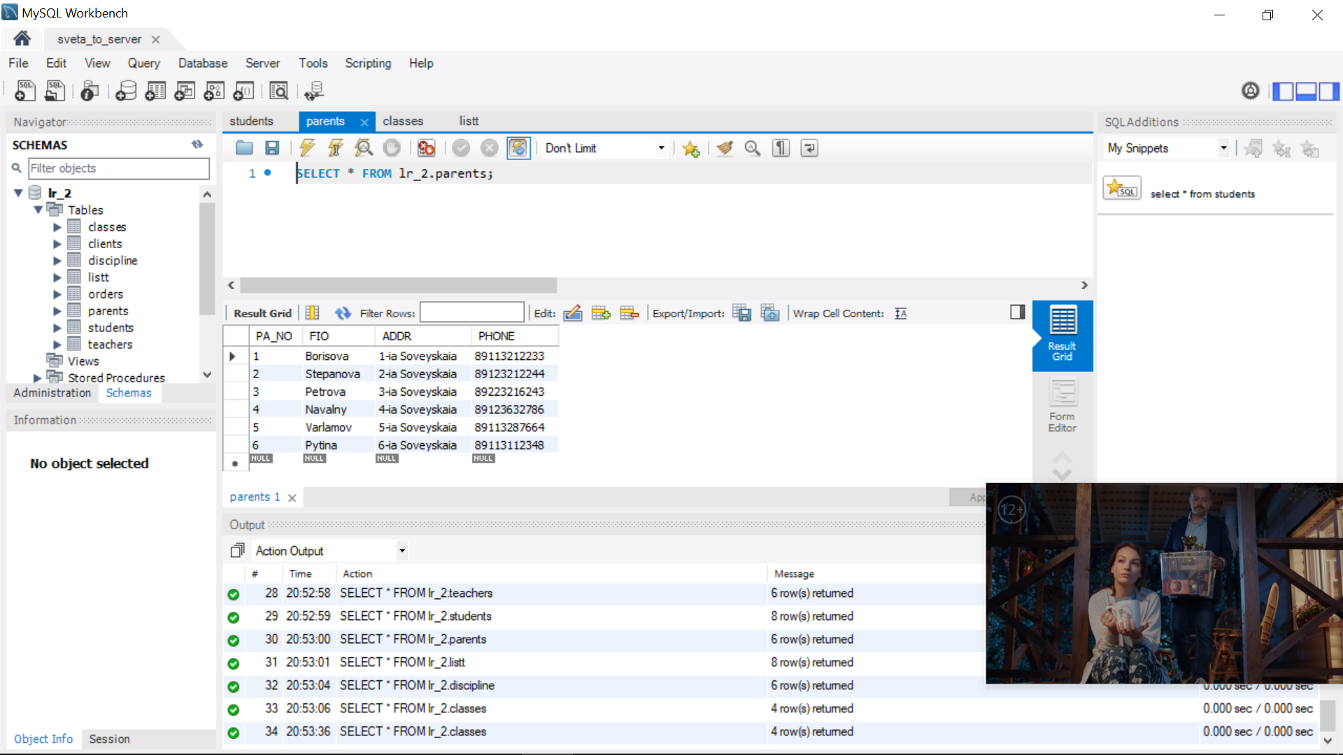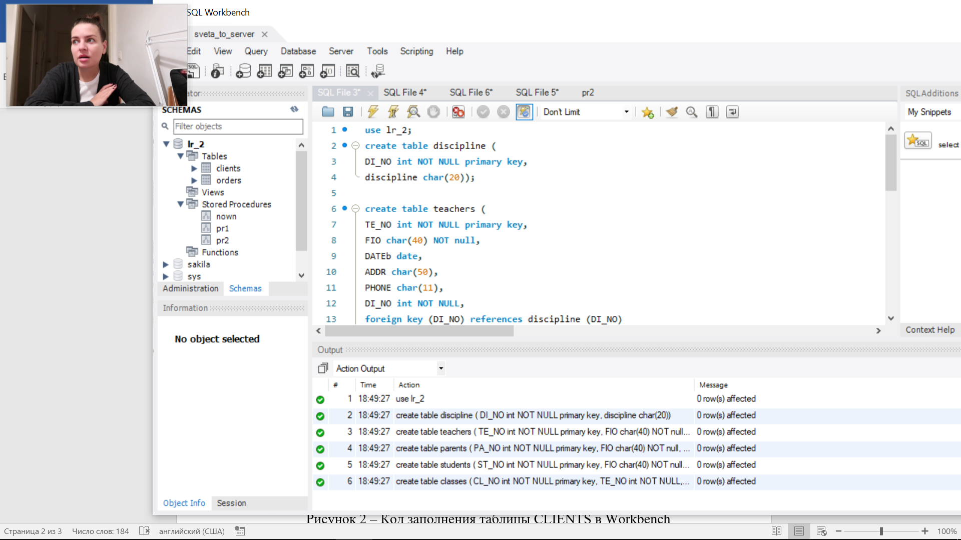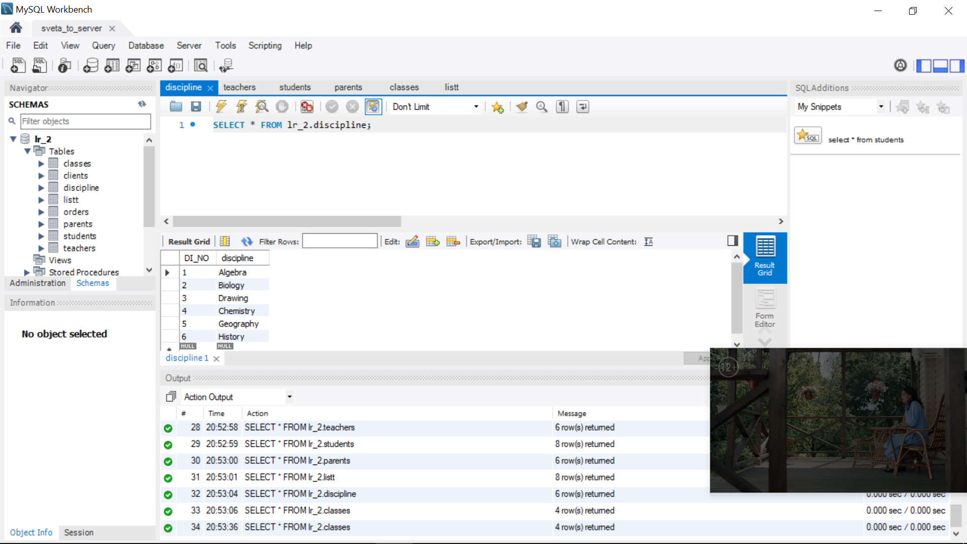 Была создана база данных lr_2 в Workbench, в которой были созданы 6 таблиц: discipline, teachers, parents, students, classes, результат продемонстрирован на рисунке 1.