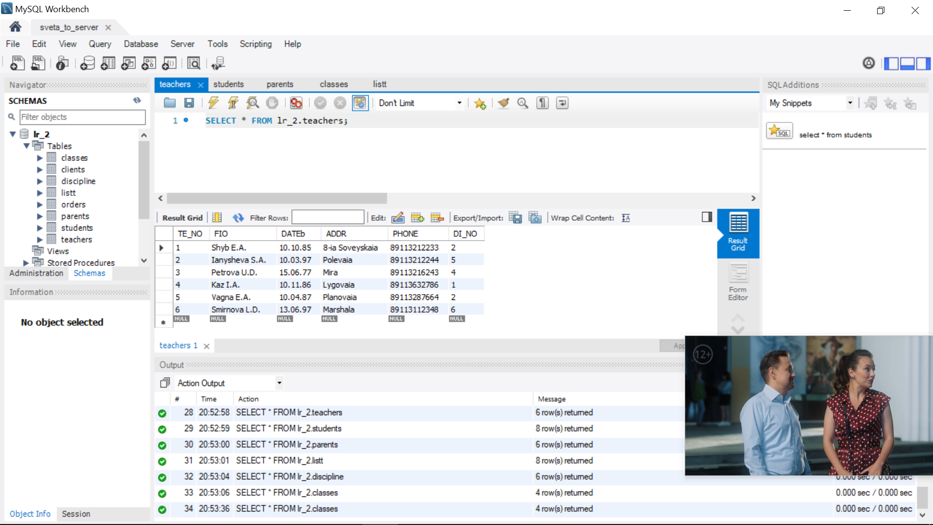 insert into teachers values ('1', 'Shyb E.A.', '10.10.85', '8-ia Soveyskaia', '89113212233', '2'); insert into teachers values ('2', 'Ianysheva S.A.', '10.03.97', 'Polevaia', '89113212244', '5'); insert into teachers values ('3', 'Petrova U.D.', '15.06.77', 'Mira', '89113216243', '4'); insert into teachers values ('4', 'Kaz I.A.', '10.11.86', 'Lygovaia', '89113632786', '1'); insert into teachers values ('5', 'Vagna E.A.', '10.04.87', 'Planovaia', '89113287664', '2'); insert into teachers values ('6', 'Smirnova L.D.', '13.06.97', 'Marshala', '89113112348', '6');
