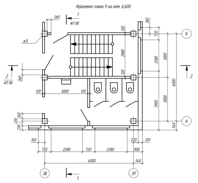 В более крупном масштабе ( 1:100 ) выполнен «Фрагмент плана 9 на отметке 6,600». Условные изображения материала нанесены на разрезе колонн и перегородок, кроме того, показаны четверти в оконных проемах и элементы санитарно-технического оборудования.