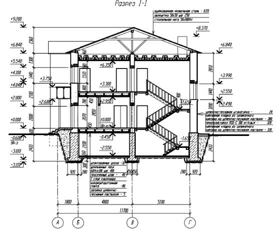 перекрытий, привязки проёмов по высоте; − с внешней стороны разреза: высотные отметки подошвы фундаментов, уровня земли, цоколя, низа и верха проёмов, архитектурных элементов