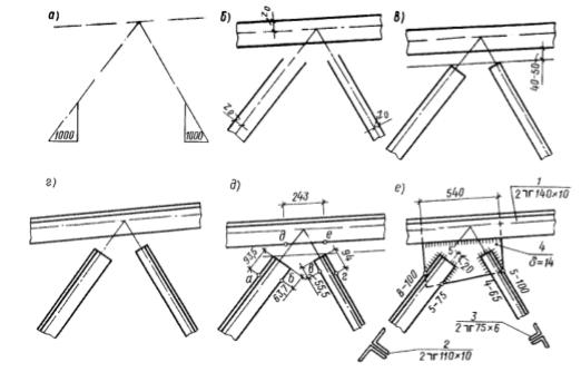 3. Верхний и нижний пояса соединяются с раскосами и стойками с помощью металлического листа – фасонки или косынки, к которой их приваривают. Последовательность построения узла фермы приведена на рис. 2.