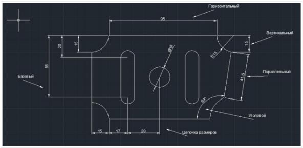 горизонтальными, вертикальными, параллельными, повернутыми, ординатными. Можно проставлять размеры от общей базы и образовывать размерные цепочки.