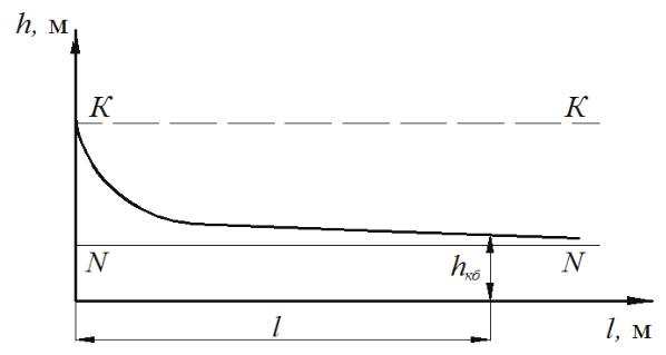 – если же, наоборот, длина кривой спада будет больше длины быстротока, то глубина на конце быстротока определяется по графику: на горизонтальной оси длин откладывается значение длины быстротока (см. табл. 1), поднимается вертикаль до пересечения с кривой свободной поверхности, далее слева на вертикальной оси глубин снимается значение hкб .