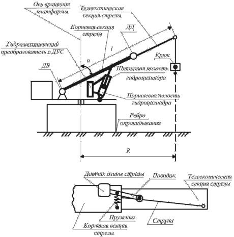 Датчик длины стрелы ДД устанавливается на корневой секции стрелы. Ролик, закрепленный на конце вращающего вал датчика поводка, прижимается к струне пружиной и перемещается по струне, натянутой на телескопической части стрелы (рис. 3.11, в). Благодаря тому, что струна натянута по диагонали, при выдвижении телескопа происходит поворот вала датчика. Иногда вместо одного используются три ролика, между которыми проходит струна. Пружина при этом отсутствует. ДД длину стрелы преобразует в электрический сигнал.