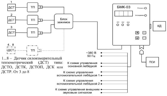 б) выдачу в систему управления крана до четырех (в зависимости от модификации) релейных, дискретных управляющих сигналов для включения внешней звуковой сигнализации и остановки механизма подъёма конкретной грузоподъёмной лебёдки при её перегруз-