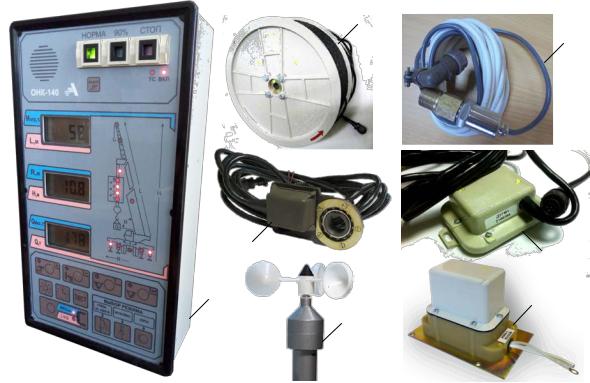 Например, ограничители для башенных кранов (ОНК-140-35, ОНК-140-53) дополнительно комплектуются датчиками ветра, датчиком пути и высоты подъёма крюка, вДнем предусмотрена сложная координатная защита типа ломаной линии с шестью точками перегиба отдельно для крюка и стрелы. В состав ограничителей для башенных, железнодорожных (ОНК-140-41), мостовых и дизель-электрических (ОНК-140-15-38) кранов входит блок питанияИи выходных реле, который преобразует напряжение 220 В частотой 50 Гц в постоянное напряжение + 24 В и обеспечивает коммутацию электрических цепей крана с трёхфазным напряжением 380 В и током до 16 А. Ограничители для кранов трубоукладчиков (ОНК-140-20, ОНК-140-46) имеют в своем составе датчик продольного и поперечного крена ДК, который позволяет контролировать работу машины на наклонных поверхностях.