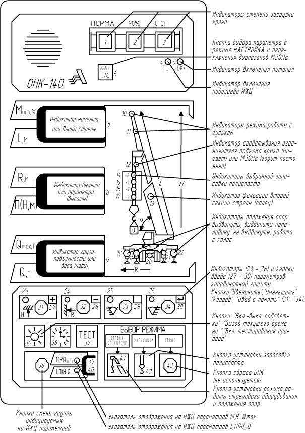 На лицевой панели БОД имеется мнемосхема крана, показывающая состояние стрелового оборудования, опорного контура, запасовку грузового полиспаста индикаторамиД14 – 17. Индикаторы ре-