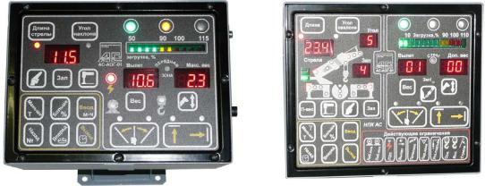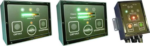 Ограничители серии АС-АОГ-02 упрощённогоИисполнения устанавливаются на легкие грузоподъёмных механизмы (краныманипуляторы, подъёмники, вышки, легкие краны, кранытрубоукладчики, легкие мостовые, козловые, портальные краны и т.п.), когда для выполнения функций защиты достаточно применить один (АС-АОГ-02.1) или два (АС-АОГ-02.2) (рис. 3.39, а и б) датчика нагрузки, а по условиям эксплуатации допустимо отсутствие координатной защиты и/или регистратора параметров. Модификация АС-АОГ-02.3 (рис. 3.39, в) содержит индикатор крена машины и применяется в комбинации с системой горизонтирования рабочей платформы [49].