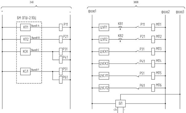 Для реализации основных и дополнительных функций управления в ОГШ-2.х имеются 4 – 8 управляющих реле, предназначенных для коммуникации цепей управления переменного тока напряжением 380 В. Управляющие реле расположены в блоке питания (2 – 3 реле) или в отдельных блоках (БП3, БЗР).