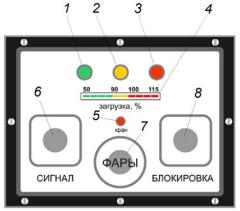Красный индикатор 3 загорается при достижении нагрузкой уровня 103% и более и горит непрерывно до тех пор, пока уровень нагрузки не снизится до величины менее 100%, после чего индикатор гаснет. Одновременно с красным индикатором включается и, соответственно, выключается непрерывный (встроенный) звуковой сигнал.