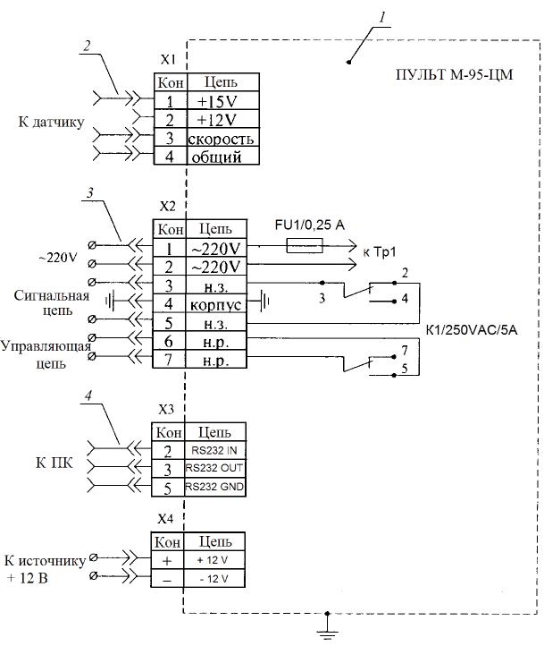 Схема электрическая соединений анемометра М-95-ЦМ представлена на рис. 9.2. Подключение пульта анемометра к датчику осуществляется через разъем X1. Подключение пульта анемометра к цепям питания от сети переменного тока 220 В или бортовой сети постоянного тока 12 В к цепям заземления, сигнализации и управления, а также к интерфейсу с компьютером осуществляется через разъёмы Х2, ХЗ, Х4 [36].