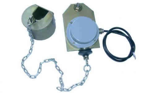 Ограничитель подъёма крюка, содержащий скользящее приспособление в виде груза, висящего вдоль грузового каната на цепи, представлен на рис. 2.2. Груз с помощью цепи связан с подпружиненным штоком концевого выключателя, установленного на оголовке стрелы. При опущенном крюке груз свободно висит на тросе и оттягивает шток, замыкая контакты выключателя.