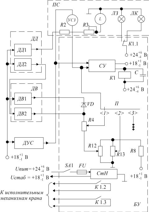напряжения и управляет состоянием реле. Если UДУС ≤ UДУГ, обмотка реле находится под напряжением, контакты реле замыкают цепи питания пр водов сполн тельных механизмов крана и работа крана разрешена. Если U > UДУГ, обмотка реле обесточена, СУ выдается ко-