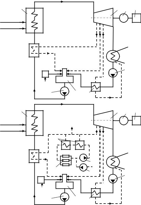 Рис. 2. Упрощенная тепловая схема электрической станции: а – КЭС (конденсационной); б – ТЭЦ (теплоэлектроцентрали); 1 – паровой котел; 2 – турбина; 3 – генератор; 4 – преобразователь электрической энергии; 5 – конденсатор; 6 – конденсатный насос; 7 – подогреватель низкого давления; 8 – деаэратор; 9 – питательный насос; 10 – установка химической очистки воды; 11 – подогреватель высокого давления; 12 – потребители теплоты; 13 – подогреватели сетевой воды (бойлеры); 14 – насос сетевой воды; 15 – подпиточный насос