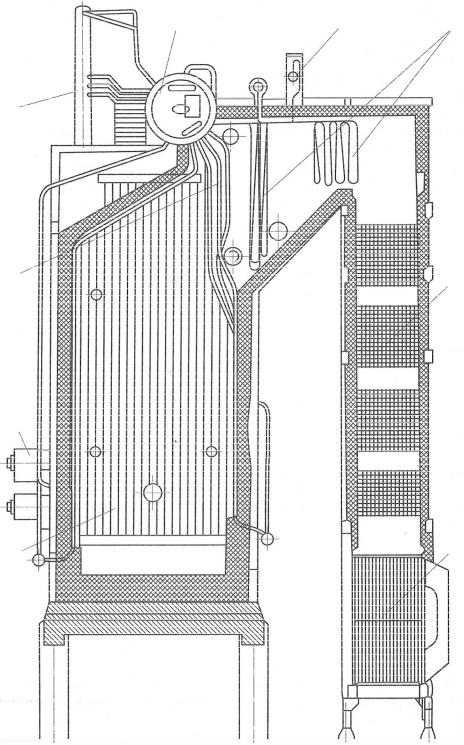 Рис. 8. Вертикально-водотрубный паровой котел типа Е-1-9-1г: 1 – верхний барабан; 2 – главный паровой вентиль; 3 – боковой экран; 4 – потолочный экран; 5