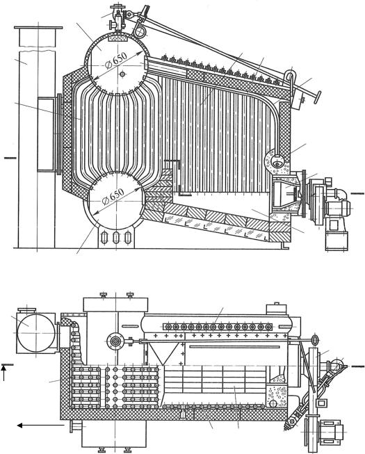 – фронтальный экран; 6 – коллектор; 7 – горелка; 8 – камерная топка; 9 – нижний барабан; 10 – котельный пучок труб; 11 – дымовая труба