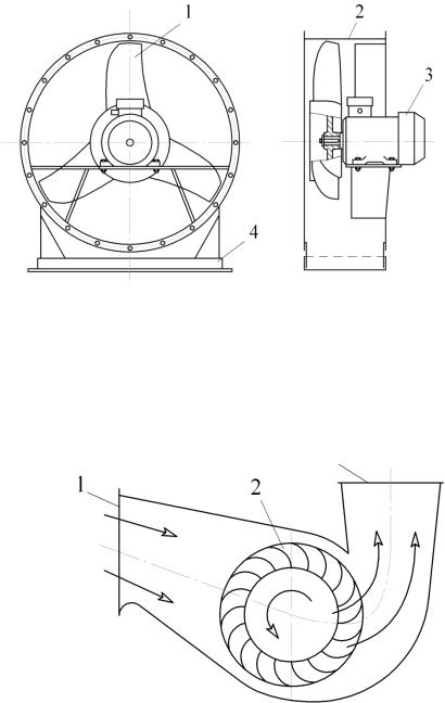 Рис. 1.1. Радиальный вентилятор: 1– входной патрубок; 2 – выходной патрубок; 3 – корпус; 4 – электродвигатель;