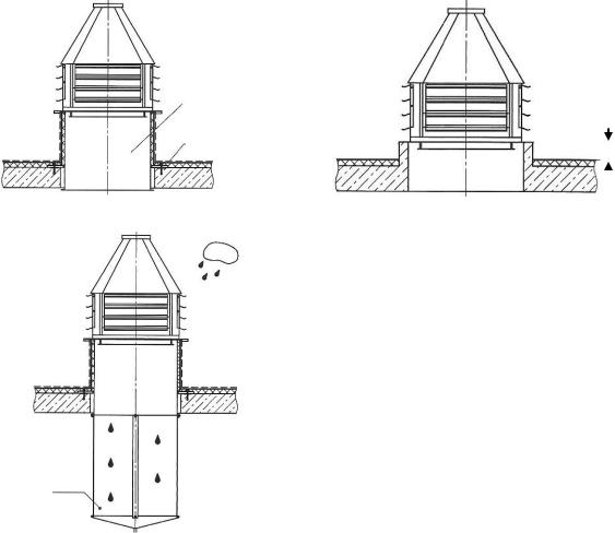 При монтаже крышных вентиляторов рекомендуется устанавливать их на монтажные стаканы СТАМ (рис. 2.35, а) для исключения протечек в местах примыкания. Монтировать вентиляторы на кровле следует с высотой Н > 400 мм из-за риска протечек от тающего снега (рис. 2.35, б).