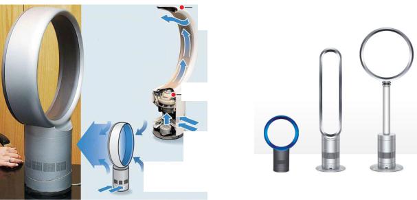 В безлопастном бытовом вентиляторе (рис. 2.39) воздушный поток формирует турбина (напорный вентилятор), спрятанная в основании и подающая воздух сквозь узкие щели в большой рамке, через которую проходит основной поток перемещаемого воздуха. За счет аэродинамических эффектов истекающий из щелей воздух увлекает за собой