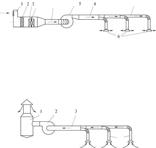 Вентиляторы применяются в системах вытяжной и приточной вентиляции с механическим побуждением воздуха. На рис. 1.4 показана типичная схема компоновки промышленной системы приточной вентиляции. Воздух из атмосферы поступает через воздухозаборное уст-