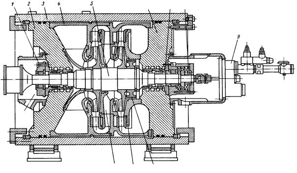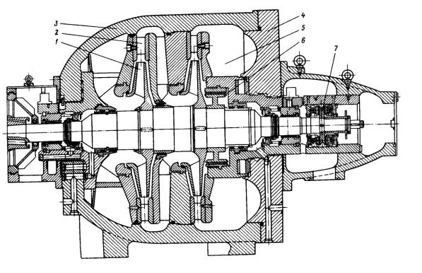 Рис. 4.36. Полнонапорный двухступенчатый нагнетатель типа 235-21 (с горизонтальным разъемом): 1 – рабочее колесо; 2 лопаточный диффузор; 3 – корпус; 4 – крышка; 5 – сборная камера; 6 – думмис; 7 – опорный подшипник