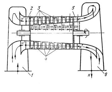При выходе из последней ступени газ проходит спрямляющий аппарат (СА) 5, который придает выходной скорости осевое направле-