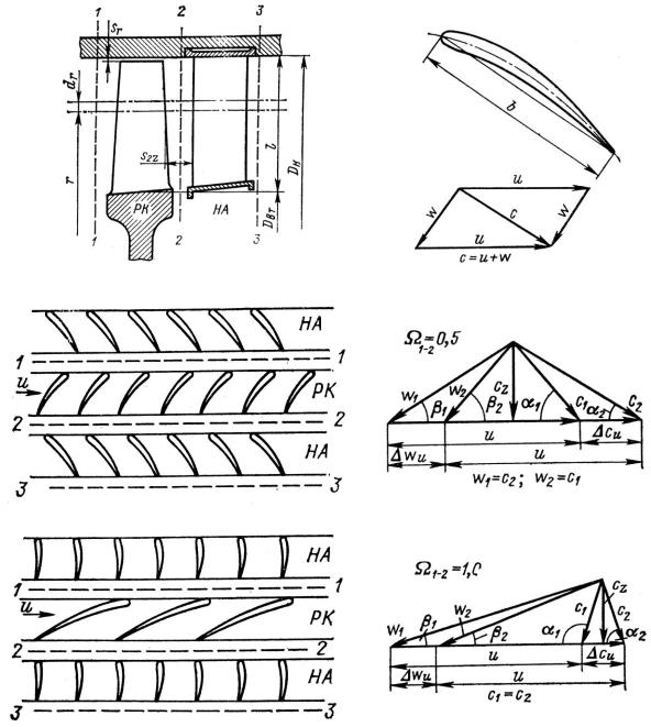 Ступенью осевого компрессораДпринято считать РК и расположенные за ним НА (рис. 4.38, а). Элементарной ступенью осевого компрессора называют ступень, расположенную между двумя соосными цилиндрическими поверхностями, радиусов r и r + dr. Развертка одной из этих поверхностей на плоскость и треугольникиИскоростей для двух ступеней с различным коэффициентом реактивности представлены на рис. 4.38, б, в. Видно, что РК и НА представляют собой лопаточные решетки, составленные из аэродинамических профилей, установленных под определенными углами. Решетка РК движется относительно решетки НА со скоростью u. Углы установки профилей выбирают такими, чтобы вход потока в решетку был безударным и сопровождался наименьшими потерями.