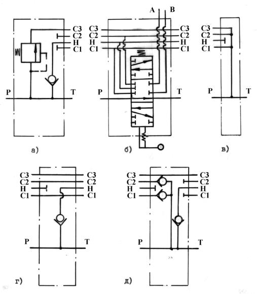 Рис. П.1. Условные обозначения секций гидрораспределителя: а – напорная; б – рабочая трехпозиционная; в – сливная;