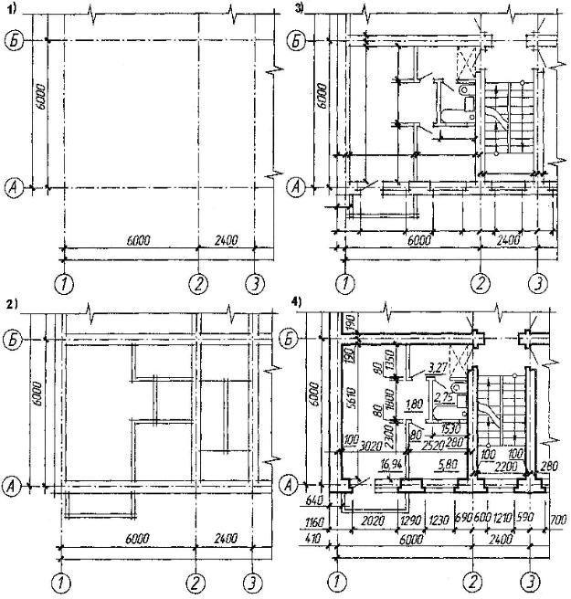 1-й этап. Вычерчивание плана начинают с нанесения координационных осей здания, продольных и поперечных для несущих и самонесущих наружных и внутренних стен здания. Эти оси являются условными геометрическими линиями, которые в отдельных случаях могут не совпадать с осями симметрии.