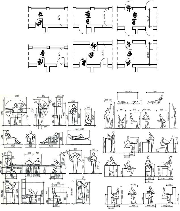 На рис. 1.3 представлена минимальная ширина коридоров при различных условиях эксплуатации. На рис. 1.4 и 1.5 представлены антропометрические эскизы, необходимые для определения зон кварти-