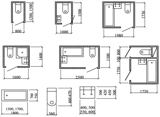 Рис. 1.2. Планировочные схемы санузлов и размеры санитарного оборудования