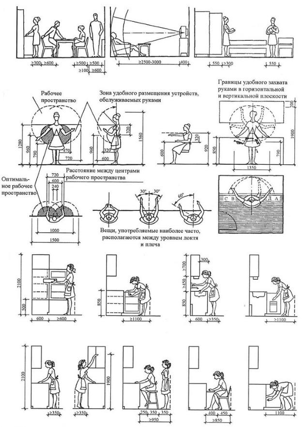 Рис. 1.5. Антропометрические эскизы: а – для определения габаритов зон квартиры (обеденной, отдыха, спальни); б, в – для определения габаритов мебели и оборудования (по Е.С. Раевой)