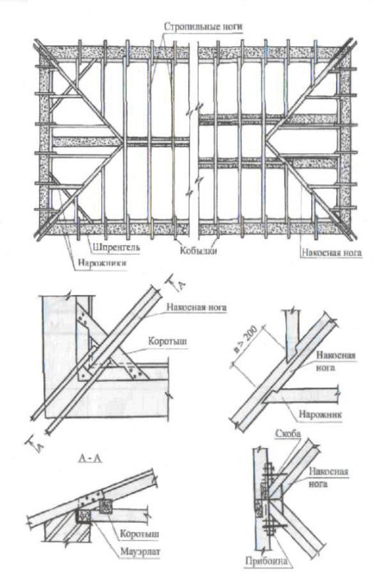 Стропильные ноги (их ширина 100 – 180 мм, высота 150–200 мм) располагают вдоль ската крыши с шагом 0,8 – 2 м, в нижней части их опирают на мауэрлаты, в верхней – на коньковый или подстропильный прогоны, уложенные по ряду стоек. Мауэрлаты сечением 150х150 мм укладывают на верхнюю часть стен на высоте 600 мм от чердачного перекрытия. Стойки и подкосы имеют размеры сечений 140–180 мм. Схватки выполняют из досок толщиной 50–60 мм. Стойки устанавливают с шагом 3 – 6 м. Устойчивость