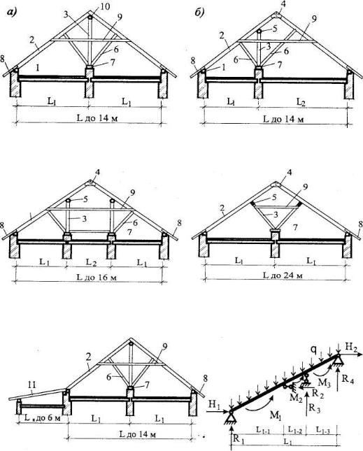 СибАДИРис.вд2.21. Схемы несущих конструкцийг двускатныхе деревянных крыш с наслонными стропилами: – здания с двумя одинаковыми пролетами